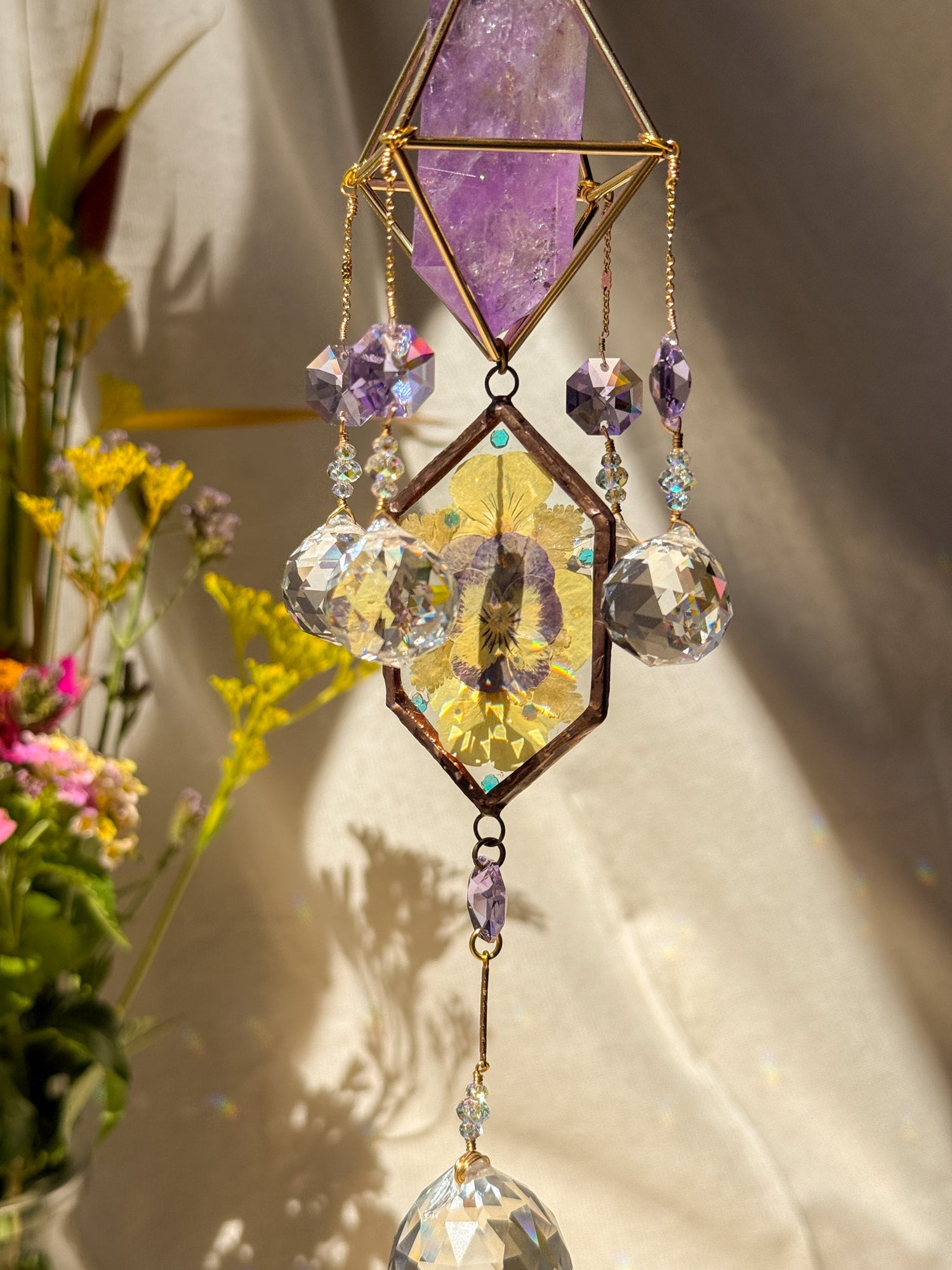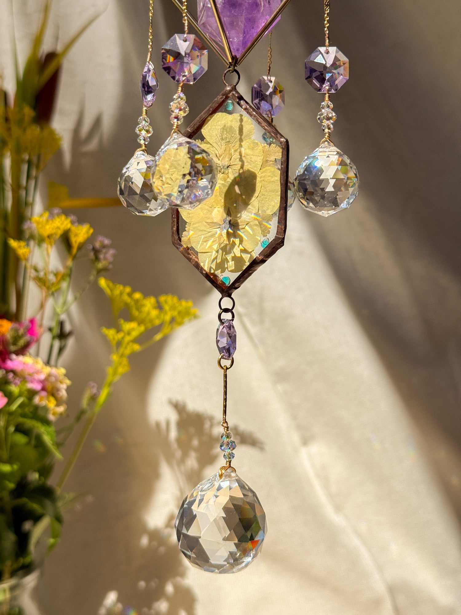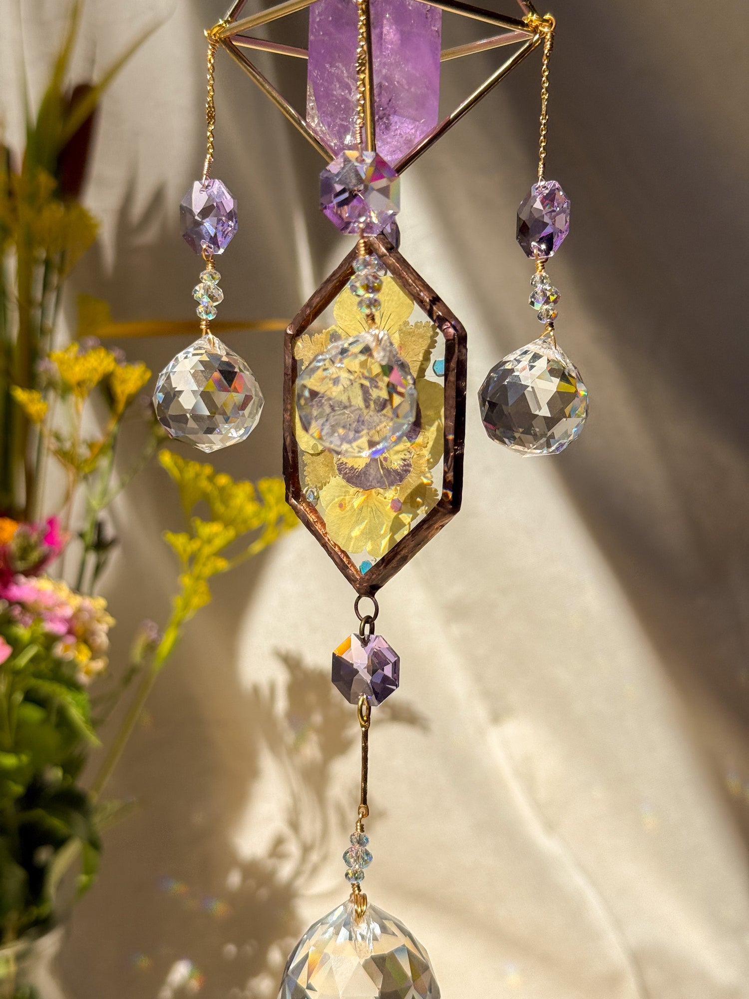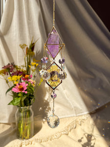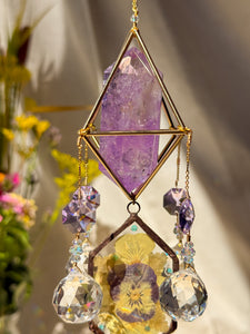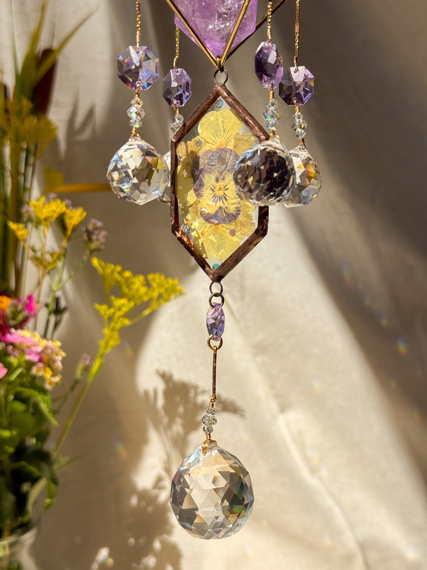 ひし形モチーフ、アメジスト、押し花ガラス加工、スワロフスキーを使ったサンキャッチャー。*ビオラを使用しています。