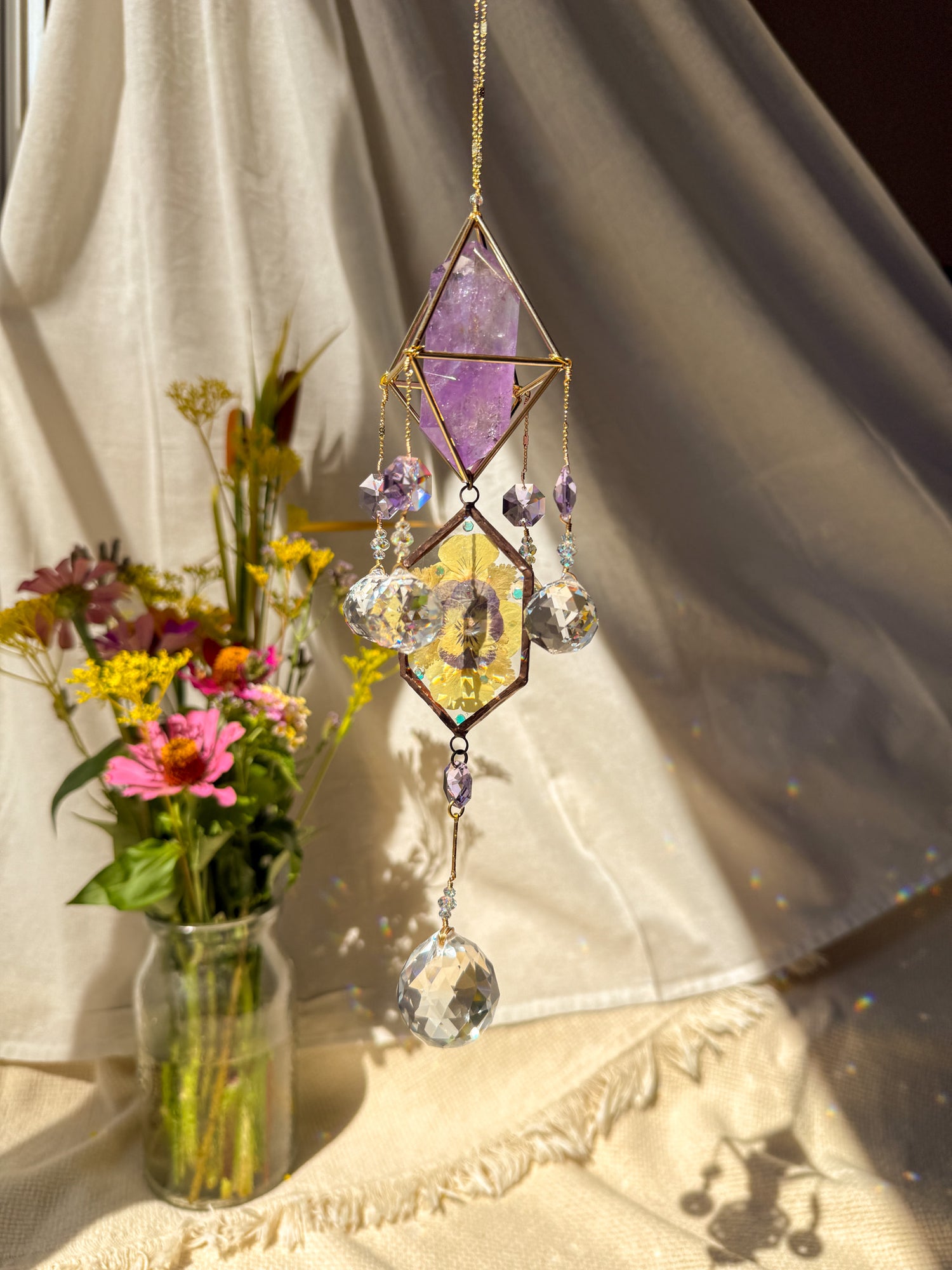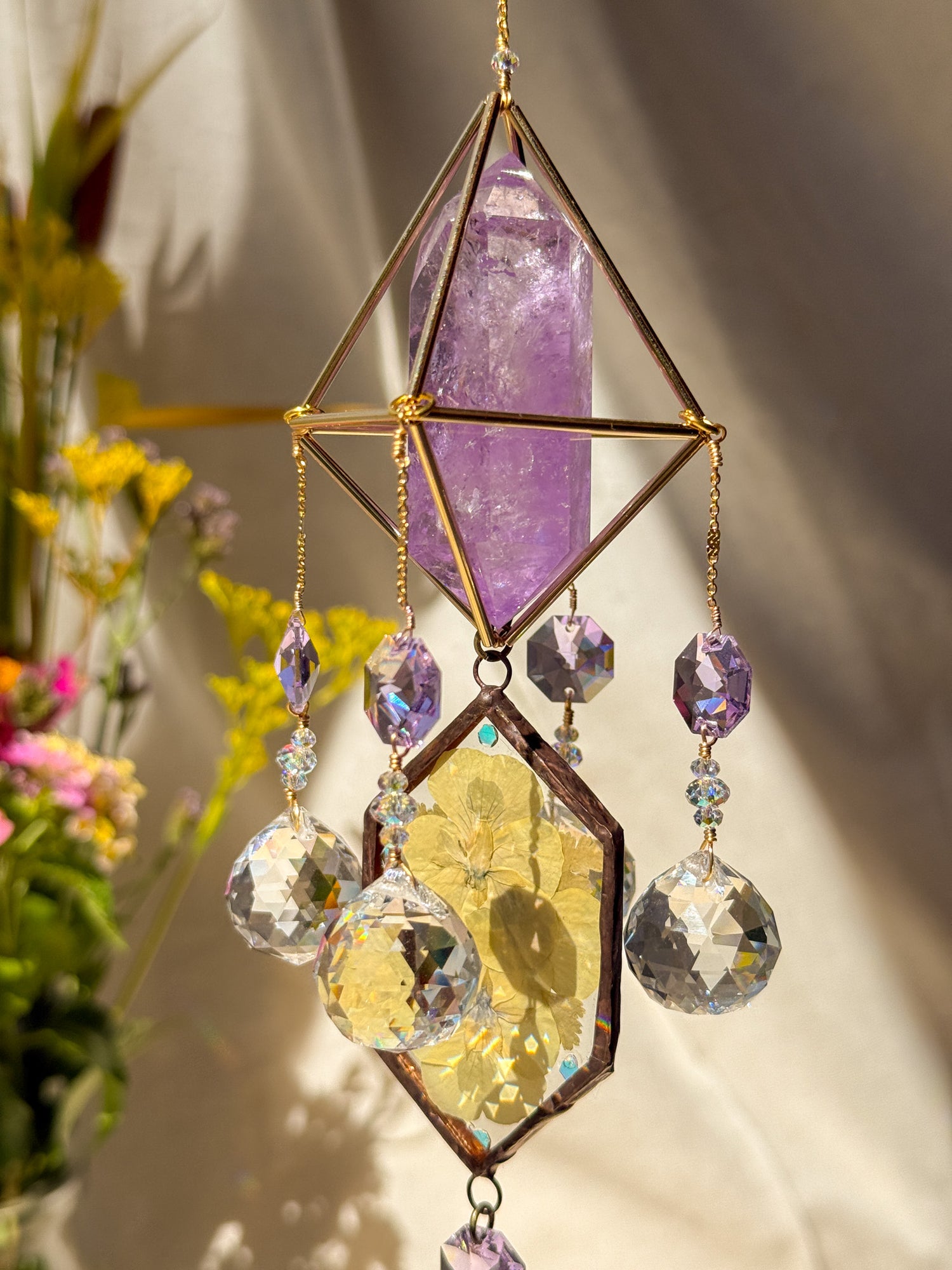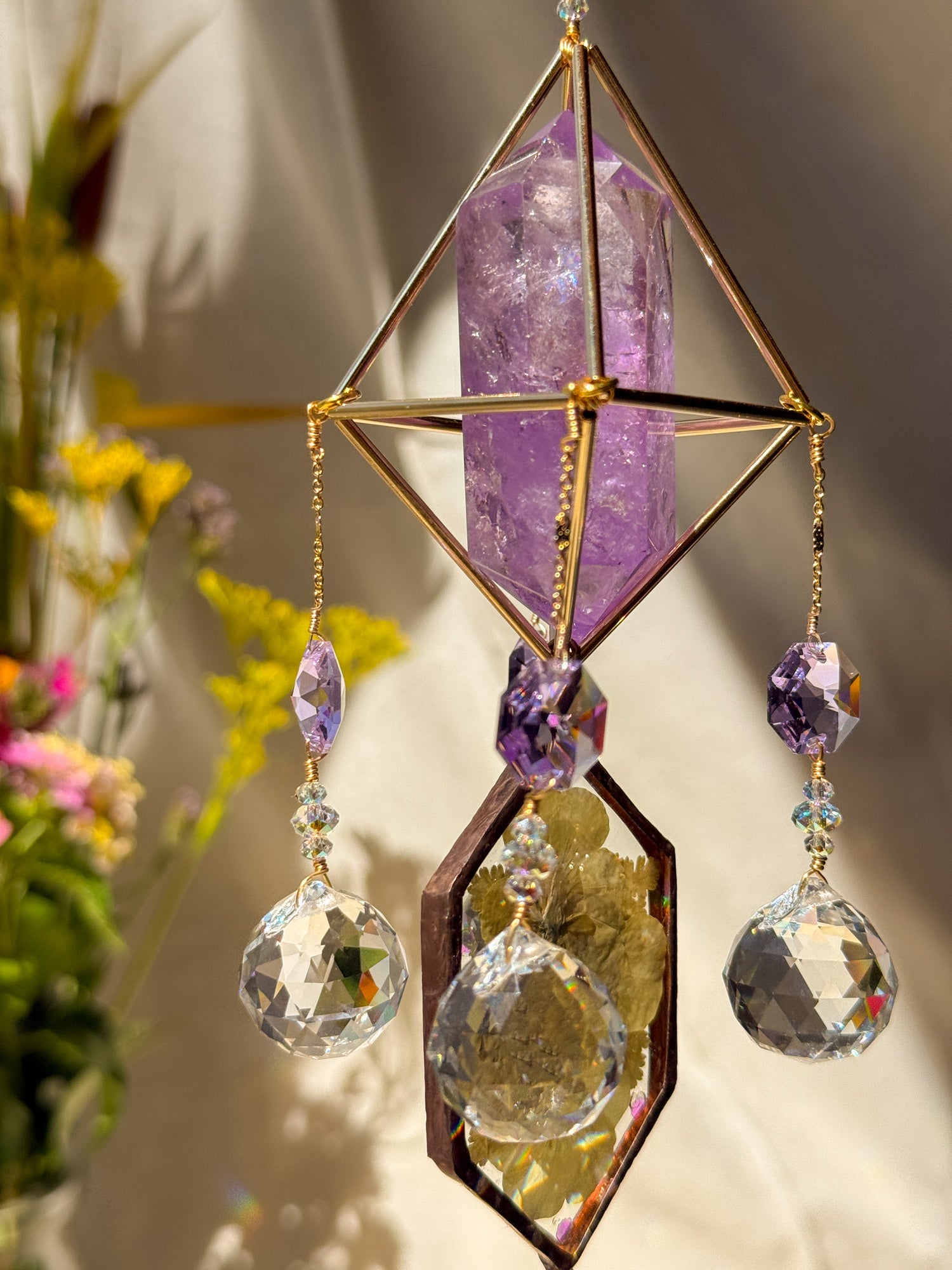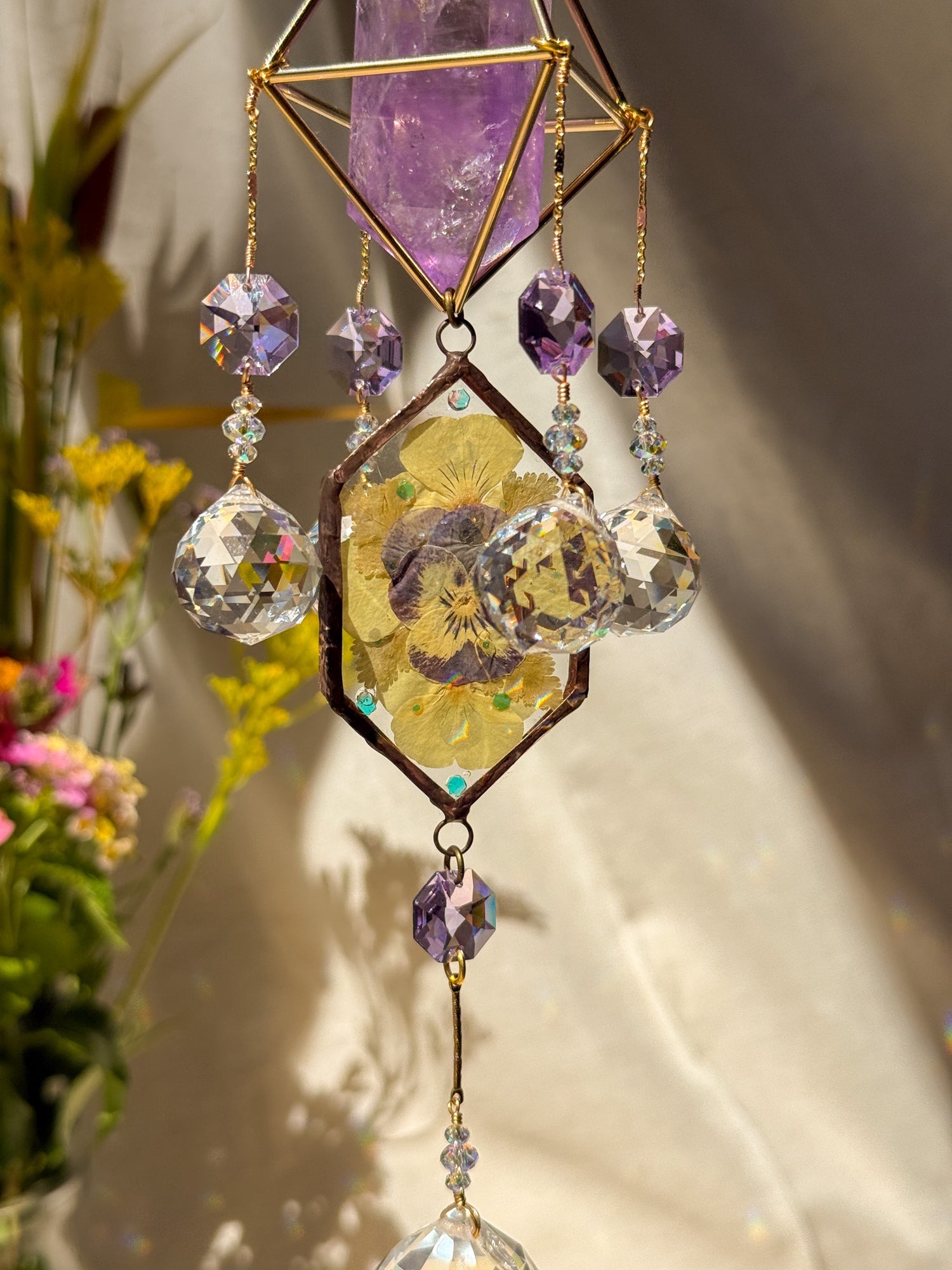 ひし形モチーフ、アメジスト、押し花ガラス加工、スワロフスキーを使ったサンキャッチャー。*ビオラを使用しています。