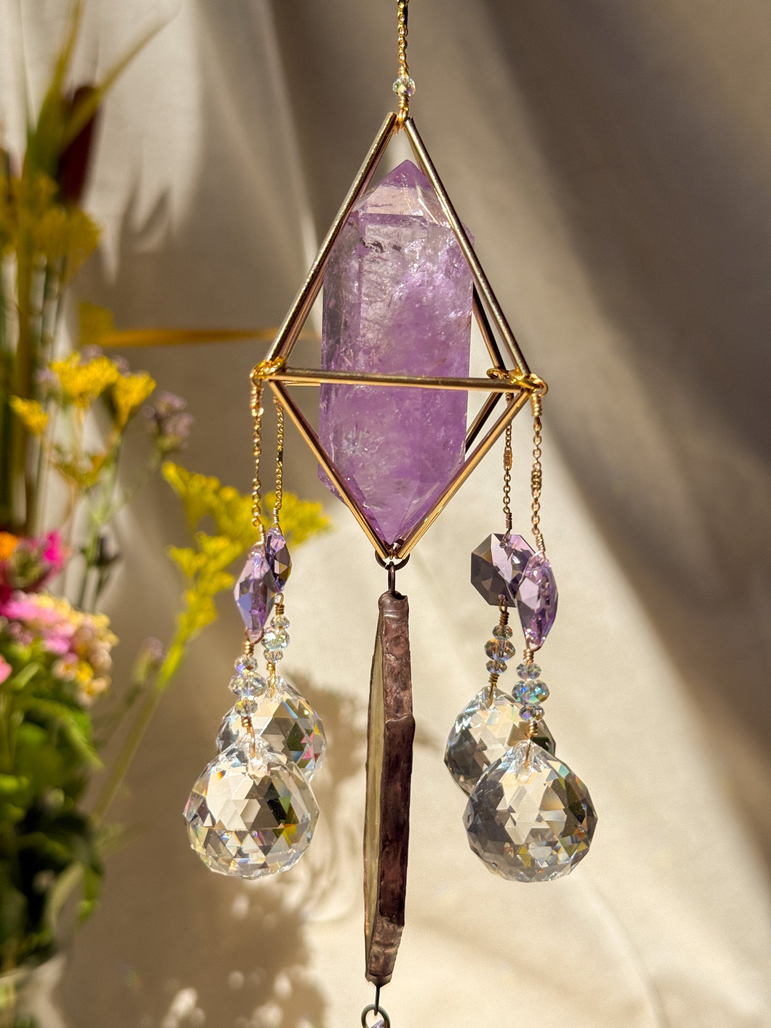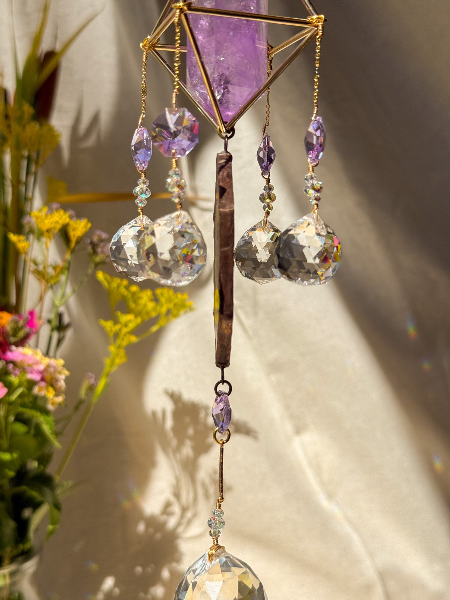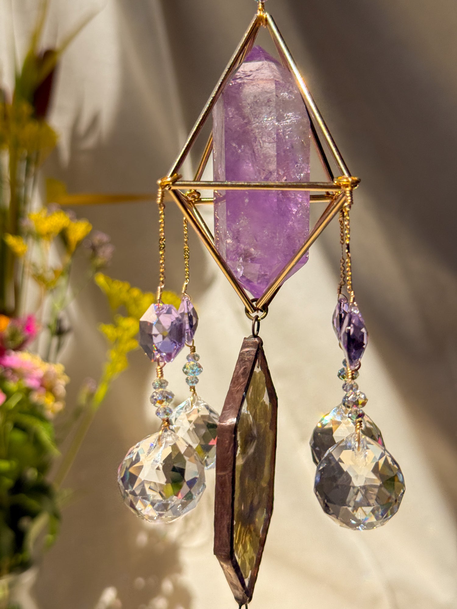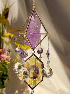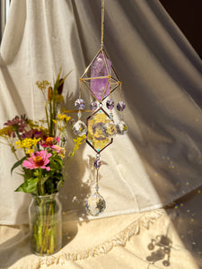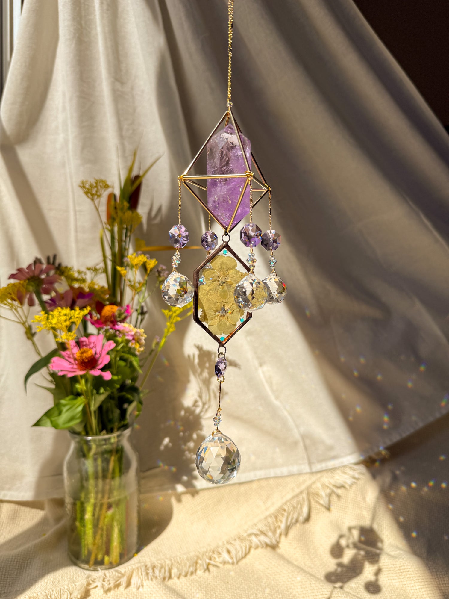 ひし形モチーフ、アメジスト、押し花ガラス加工、スワロフスキーを使ったサンキャッチャー。*ビオラを使用しています。