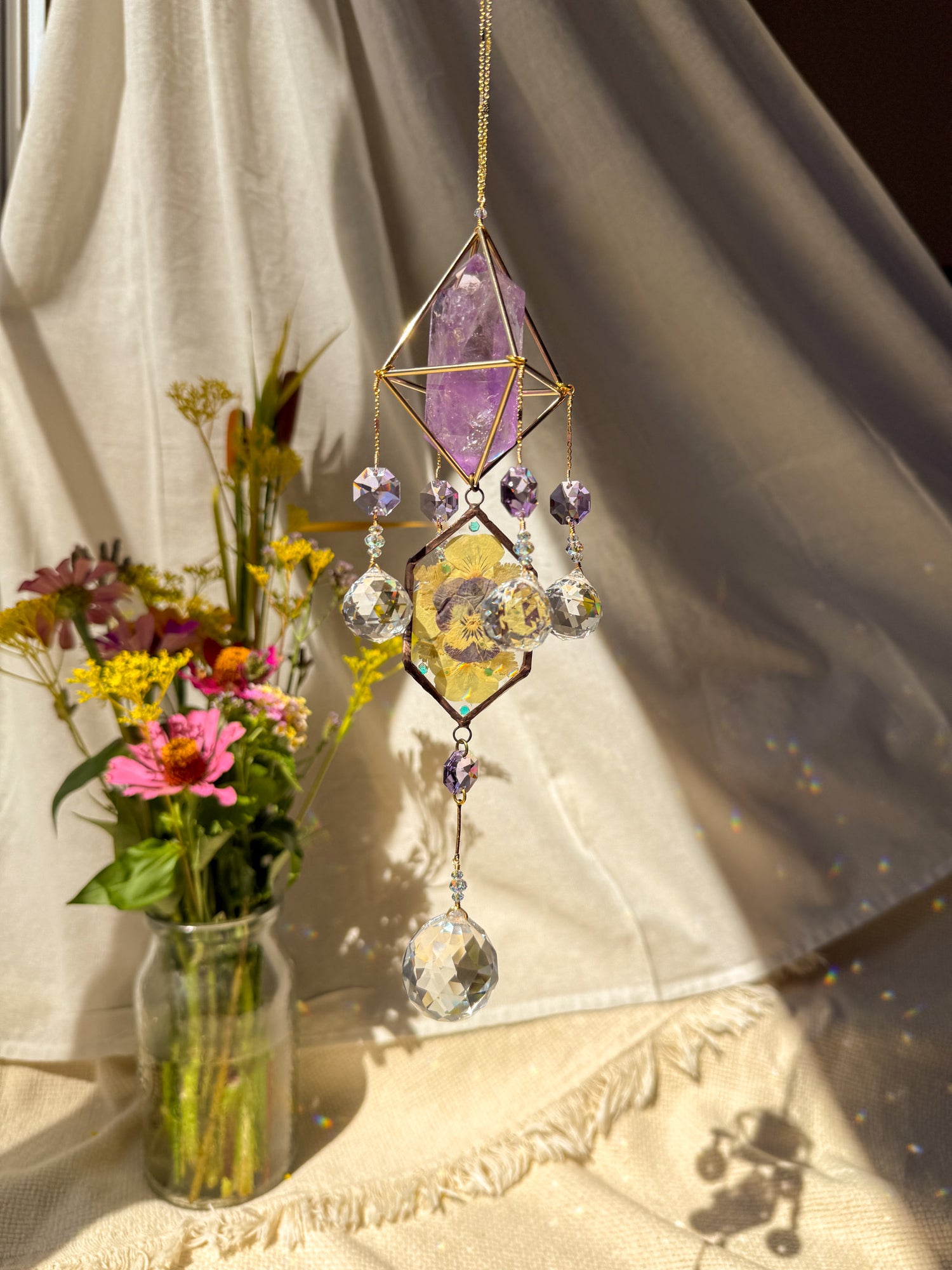 Suncatcher using diamond motif, Swarovski, Galaxy rainbow aura and pressed flower.