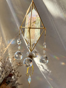 ひし形モチーフ、レインボーオーラクォーツ、スワロフスキーを使ったサンキャッチャー。