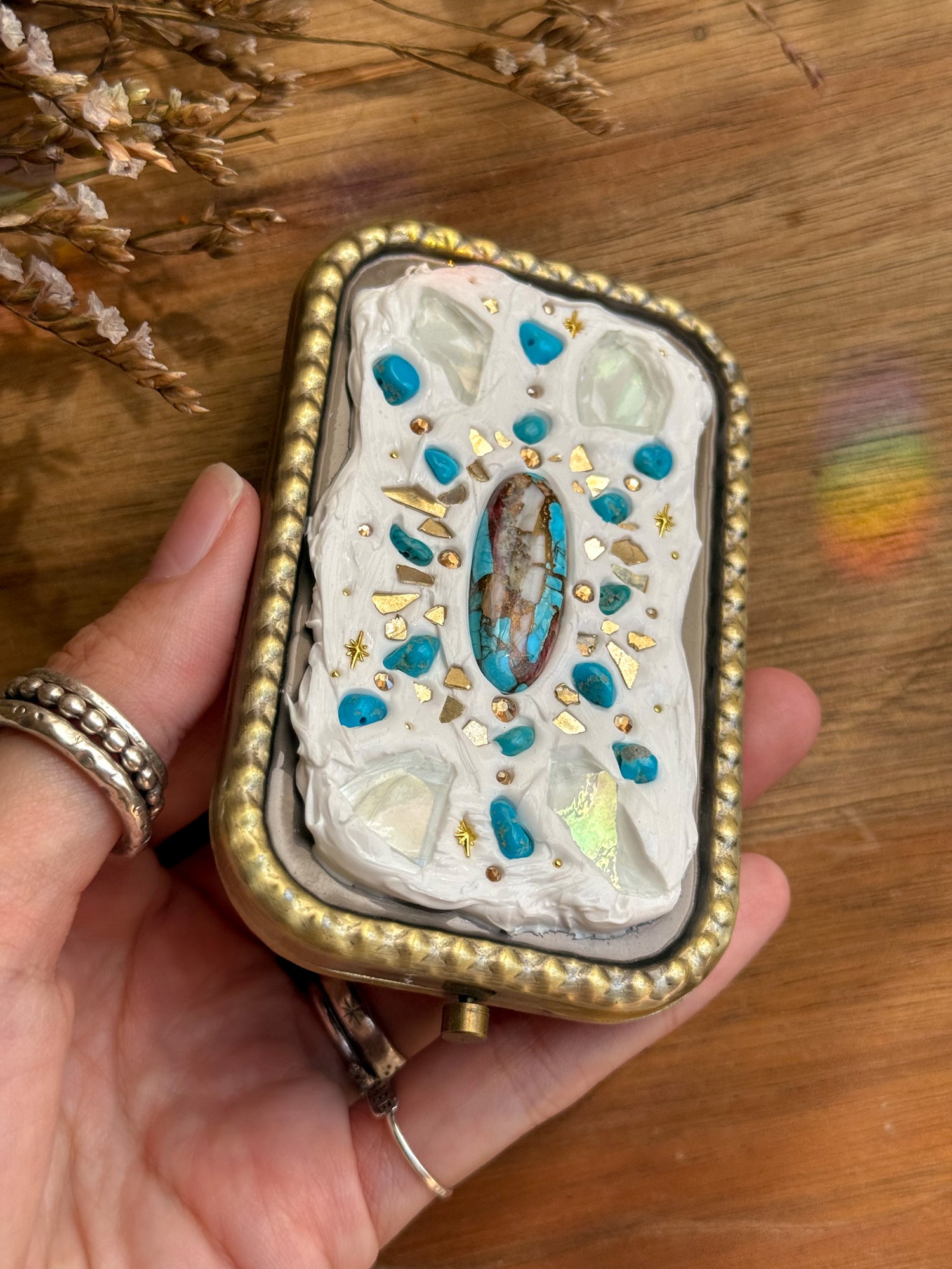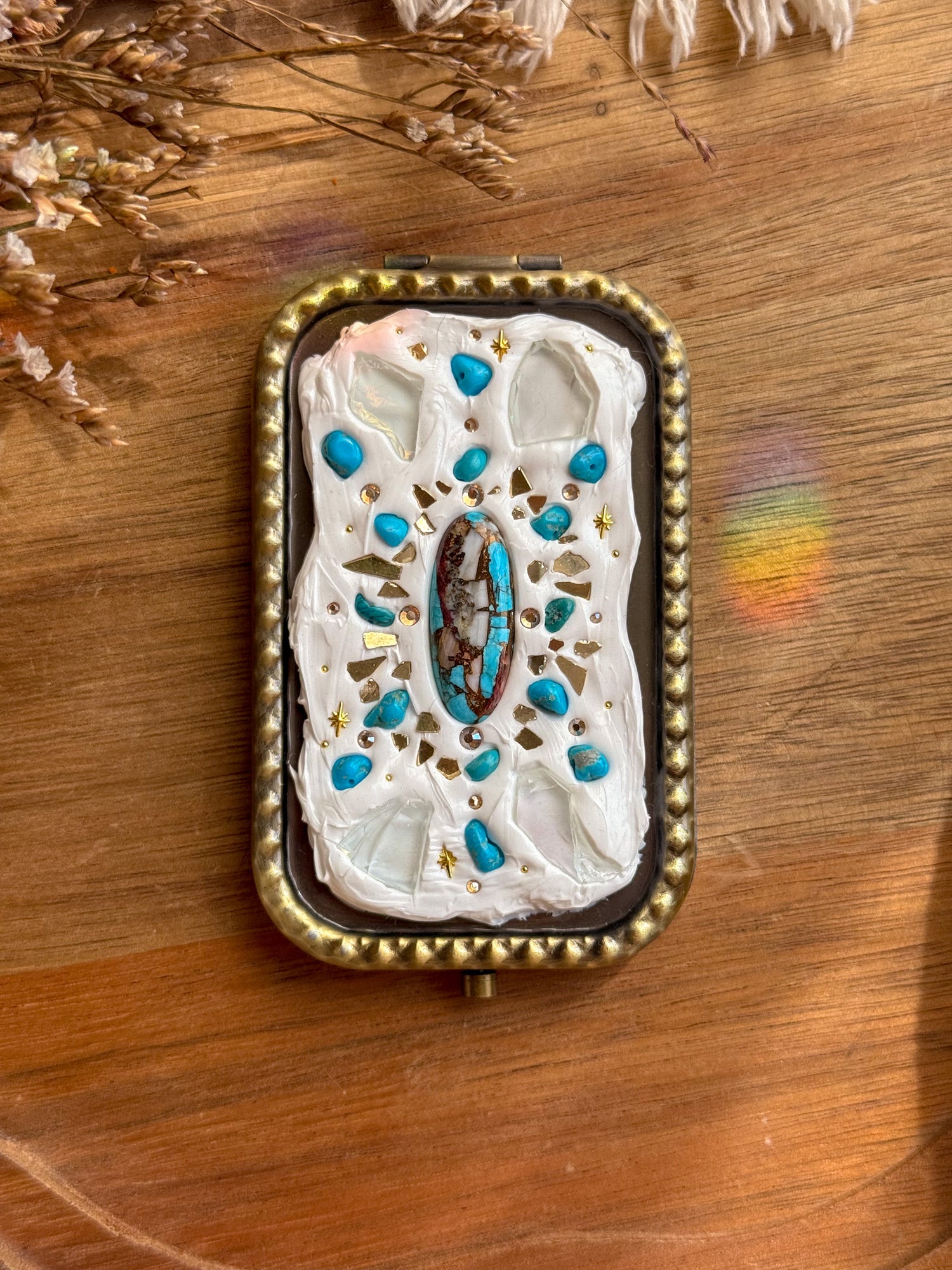 ステンドグラスの端材を利用したデコレーションコンパクトミラー。