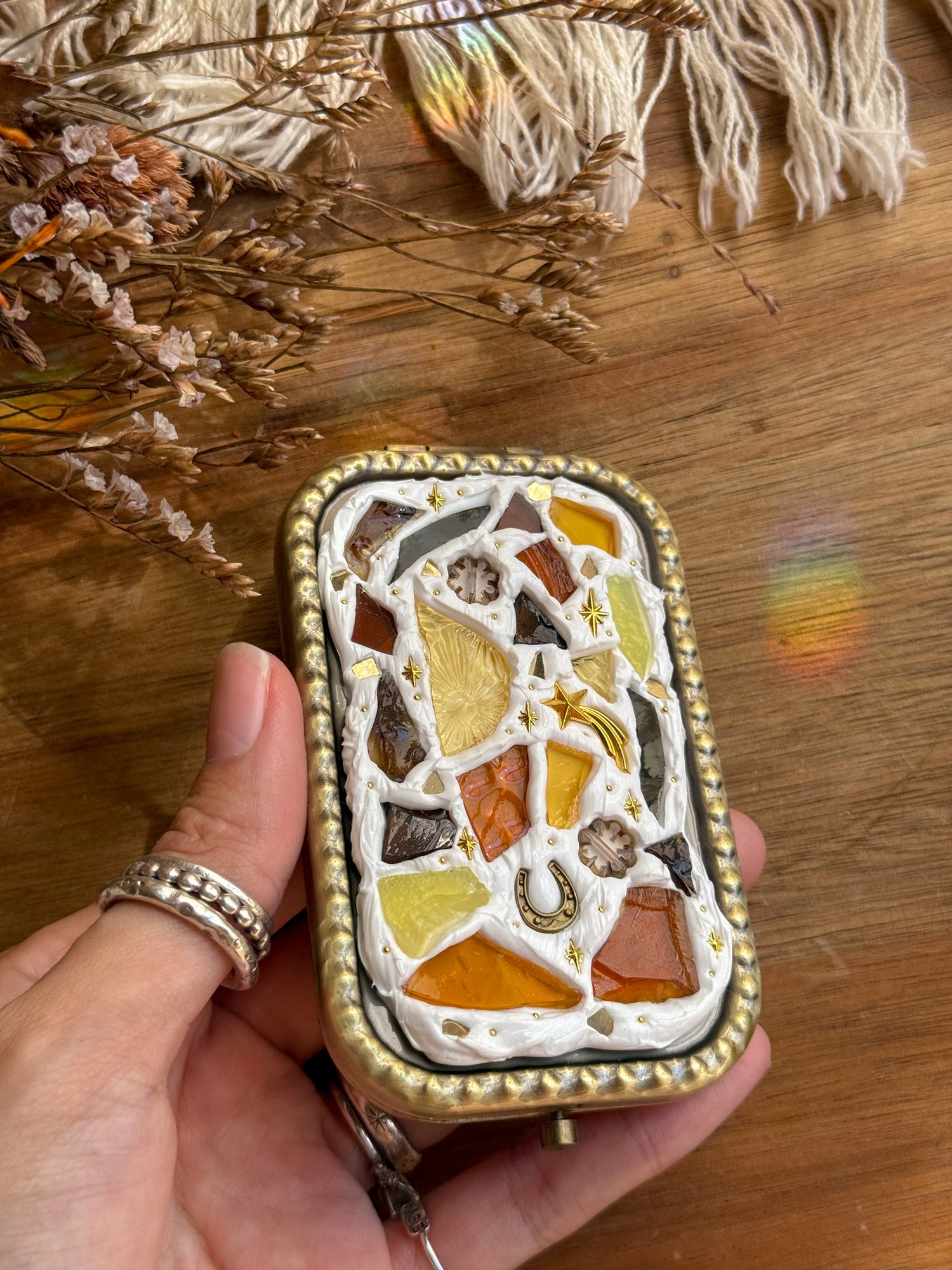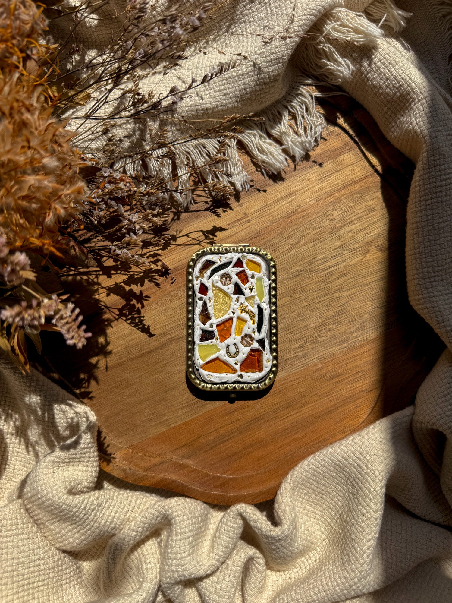 ステンドグラスの端材を利用したデコレーションコンパクトミラー。