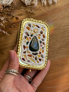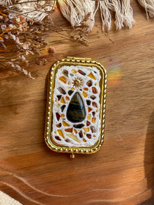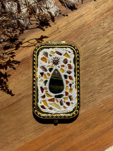 ステンドグラスの端材を利用したデコレーションコンパクトミラー。